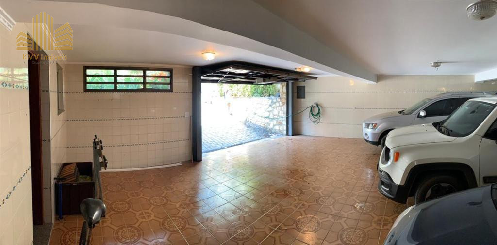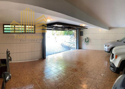 Na parte inferior, há um salão/garagem completamente azulejado com capacidade para cinco carros, além de duas salas pequenas que podem servir como depósitos. Também há um banheiro, prateleiras para despensa e uma pia. O portão eletrônico é novo e possui dois motores, permitindo uma abertura e fechamento rápidos.