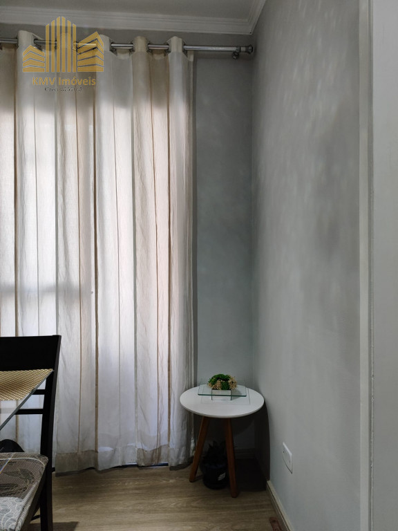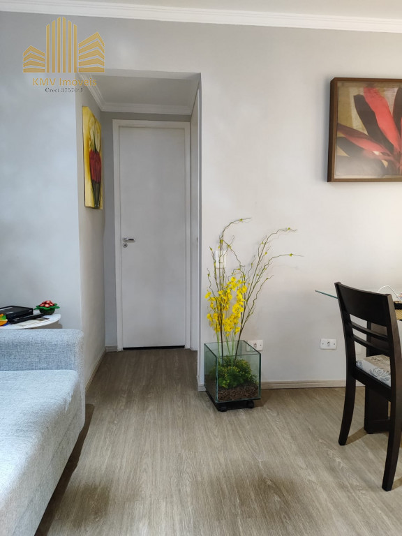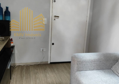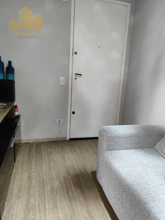 Apartamento de 1 dormitorio, 1 banheiro, 1 vaga de garagem e sala com sacada.