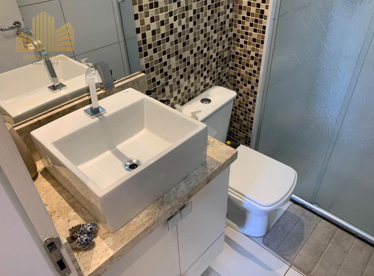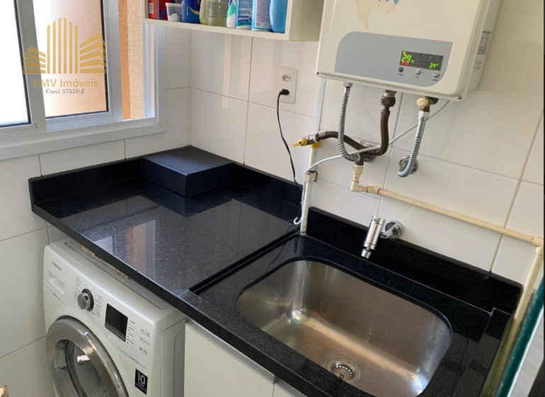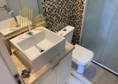 Banheiro e área de serviço com acessórios, deca, Tramontina, mármore, aquecimento a gás.