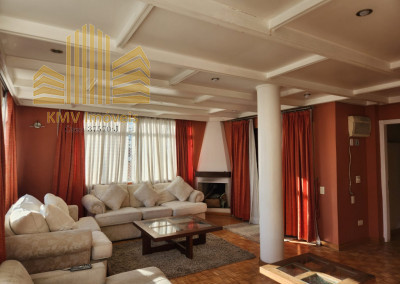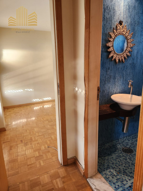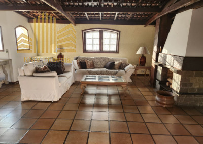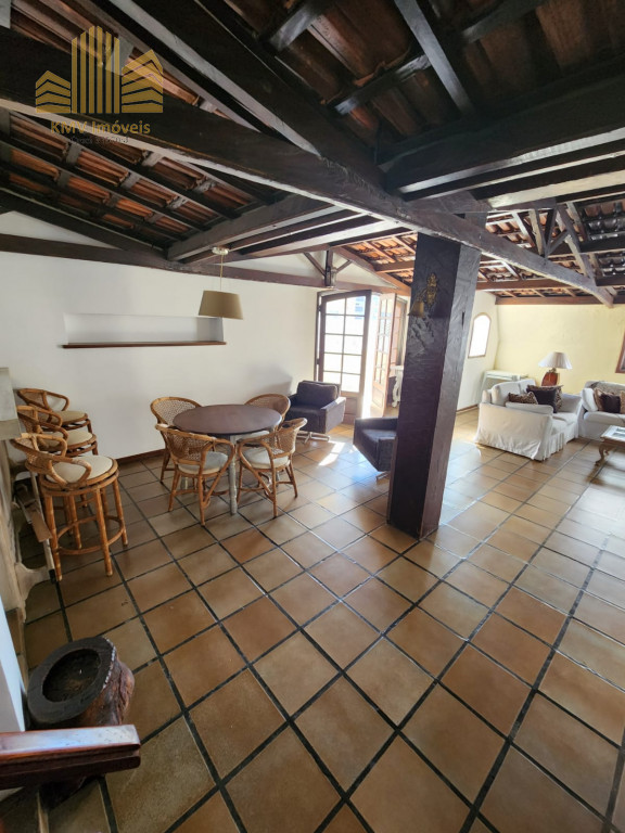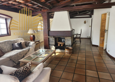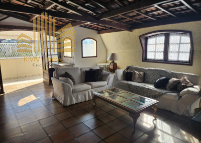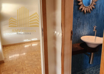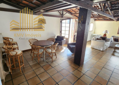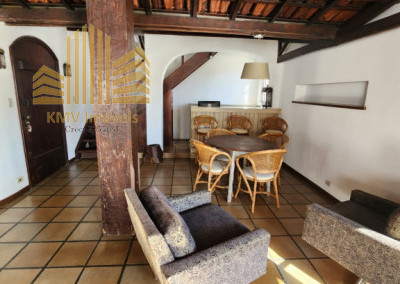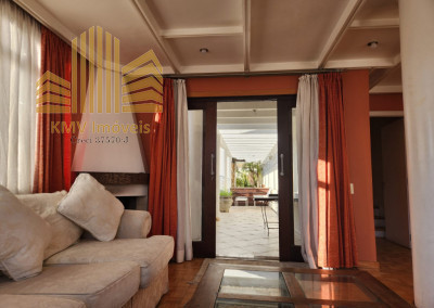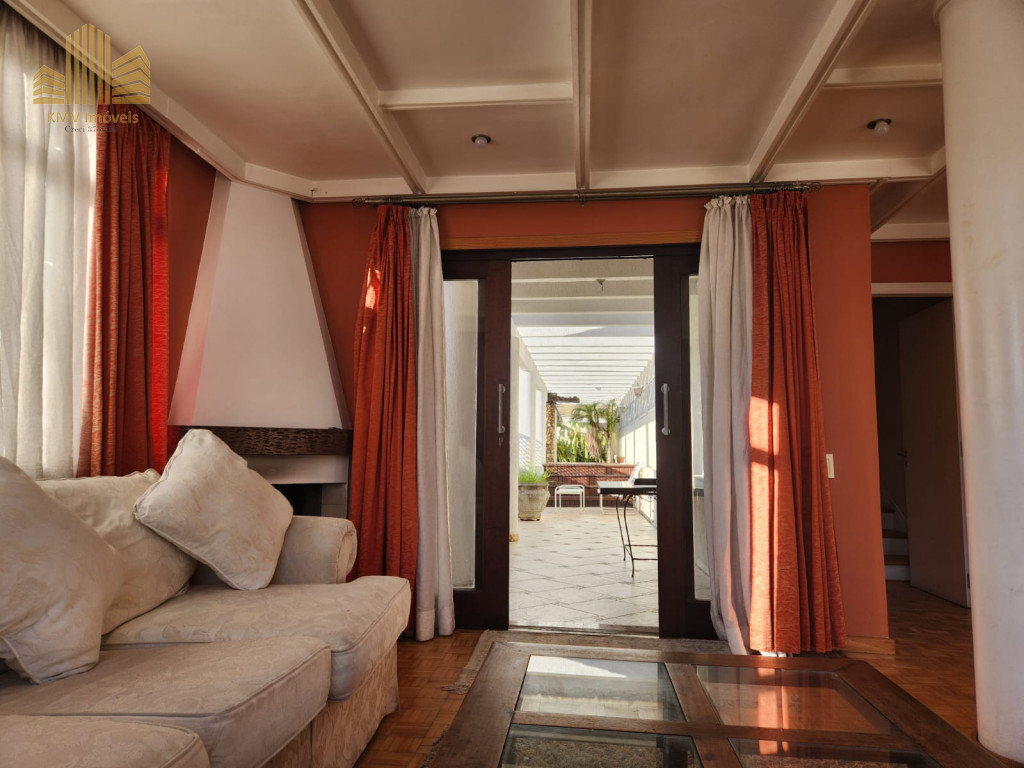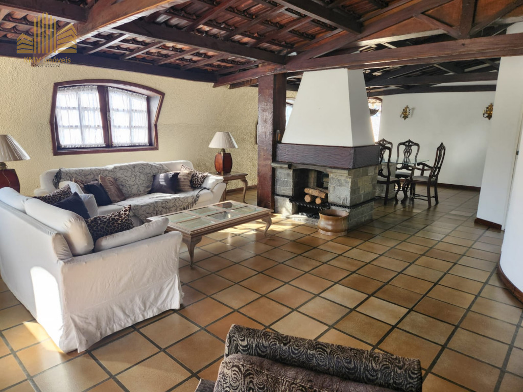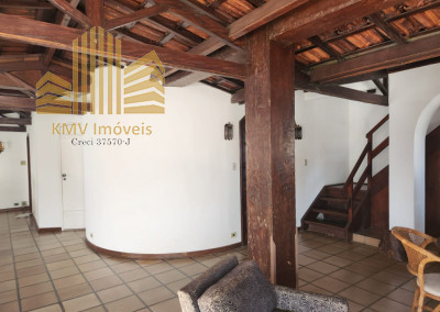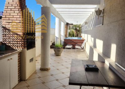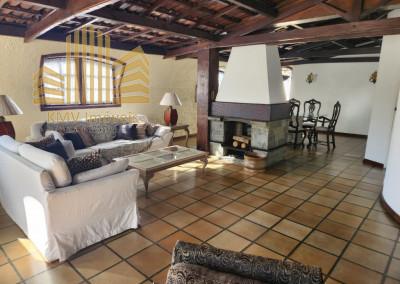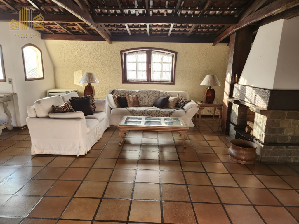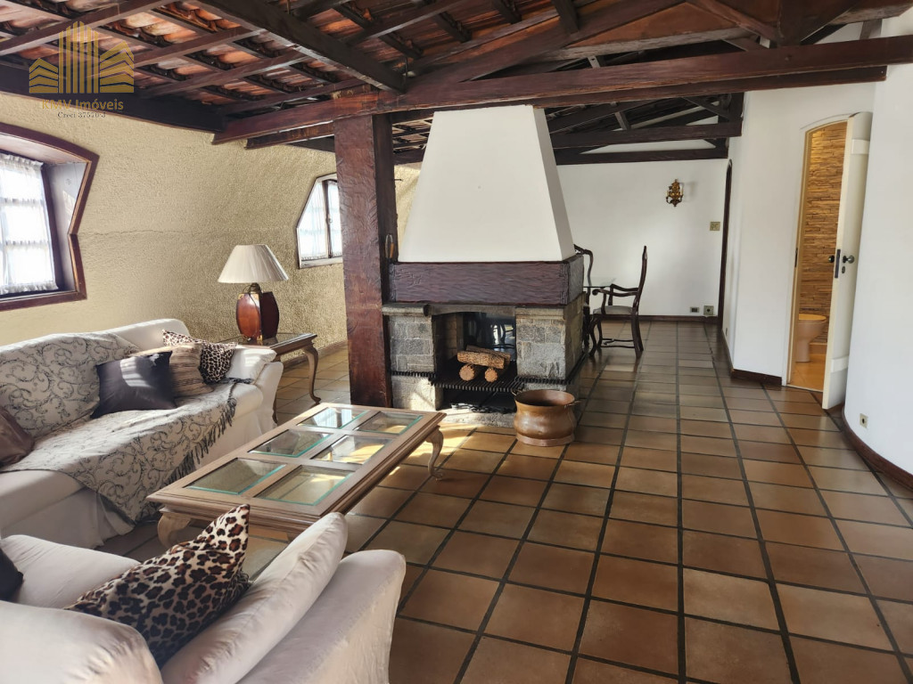 Parte superior: sala grande para 3 ambientes, tb com lareira, armário embutido para TV, despensa, varanda com 60m2 com churrasqueira, piscina, e mais escritório e lavabo.