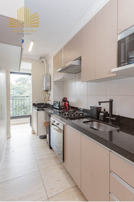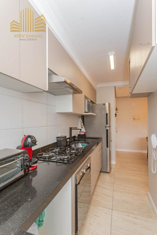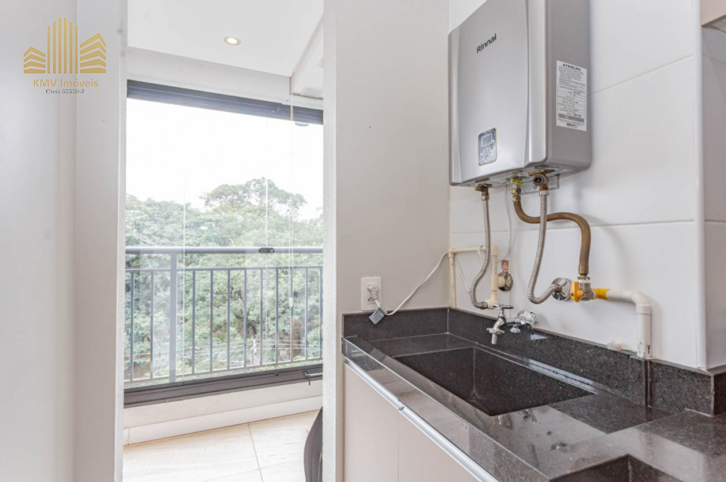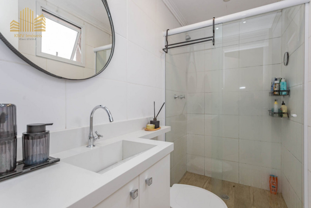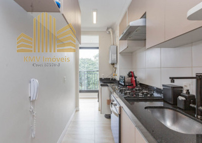 A varanda espaçosa fechada com vidro, e os banheiros são equipados com box de vidro. Cozinha com cooktop, forno e depurador.
